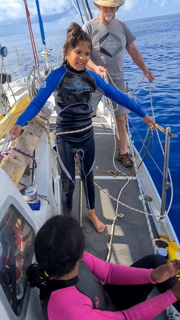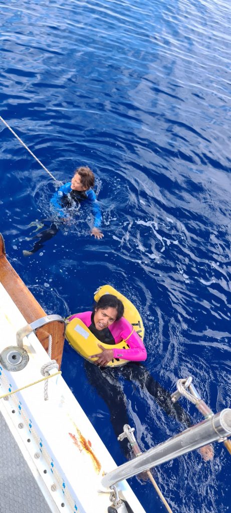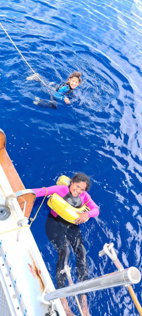 We did stop on Archie’s request to go swimming in 5000m depth water. Finn and Graham said no, both having very good reasons for not wanting to go. So, trying to be a good mummy, I said sure. I went in with him on condition he and I were each tied to a line the boys on deck always had hold of. I went in first. I wished I hadn’t gone in. It is beyond scary, I couldn’t let go of the ladder, started crying, laughing and basically had a total panic! Archie, the water nymph that he is, glided into the water and loved it. I, meanwhile, am calling mummy again and panting. It was hilarious, exhilarating, frightening and just silly. The waters were clear, soft, and warm.