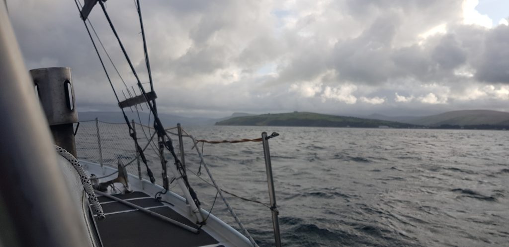 #@$%@#$%. Rough is an understatement, these were big chunky short waves. As Finn says, “they both sat there, green face with puckered lips and said, “I did not think it would be like this!” Archie threw up first, then me, then we huddle and glared at Finn for the next 10 hours, taking turns to fill the bucket. It was horrible and we were so very very unhappy. The captain decided to save his bacon and anchor off the East coast of Colonsay. So, we got some rest from the relentless violent rocking. We then decided to sail down the Irish Sea rather than the West coast of Ireland.