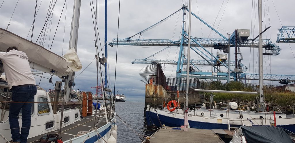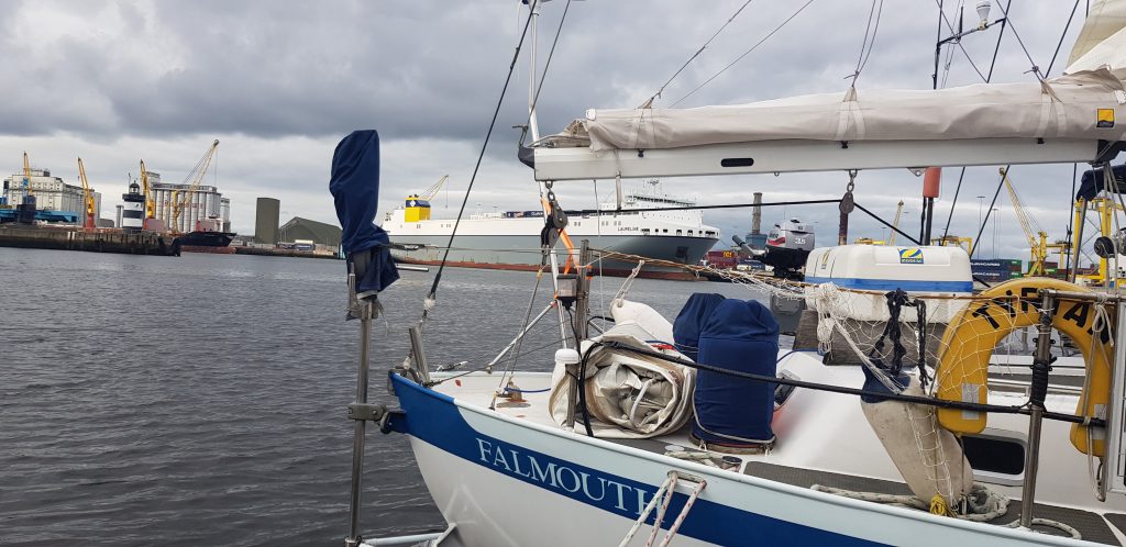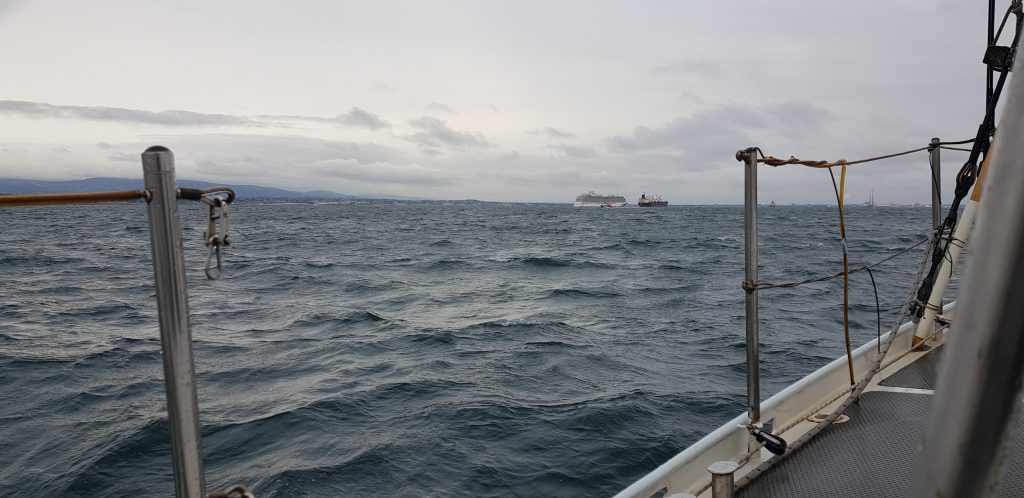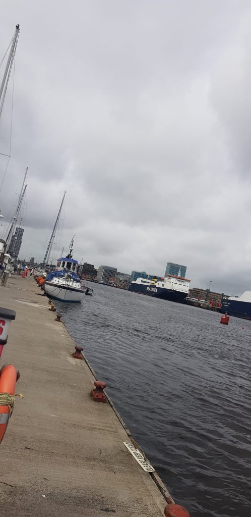 The East coast of Ireland is very beautiful, we had gigantic, long rollers, that were better but still not great. We anchored in Redbay and were rocked to sleep. I don’t sleep on the first night of anchoring. We then sailed down into Dublin’s huge commercial port! We radioed in and were told to stay on the port side of channel, so that we are not in the way of larger boats. We did great with large vessels all around us.